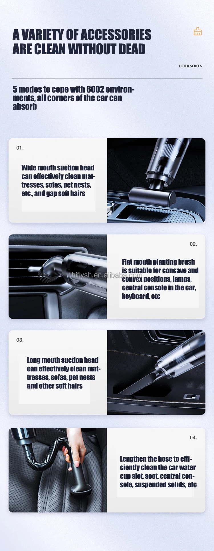 The 8-channel battery with capacity of 4000mAh provides strong suction. It's also portable and quiet for use in your car or at home. The wireless design and dow size ensure easy storage and use at any time.